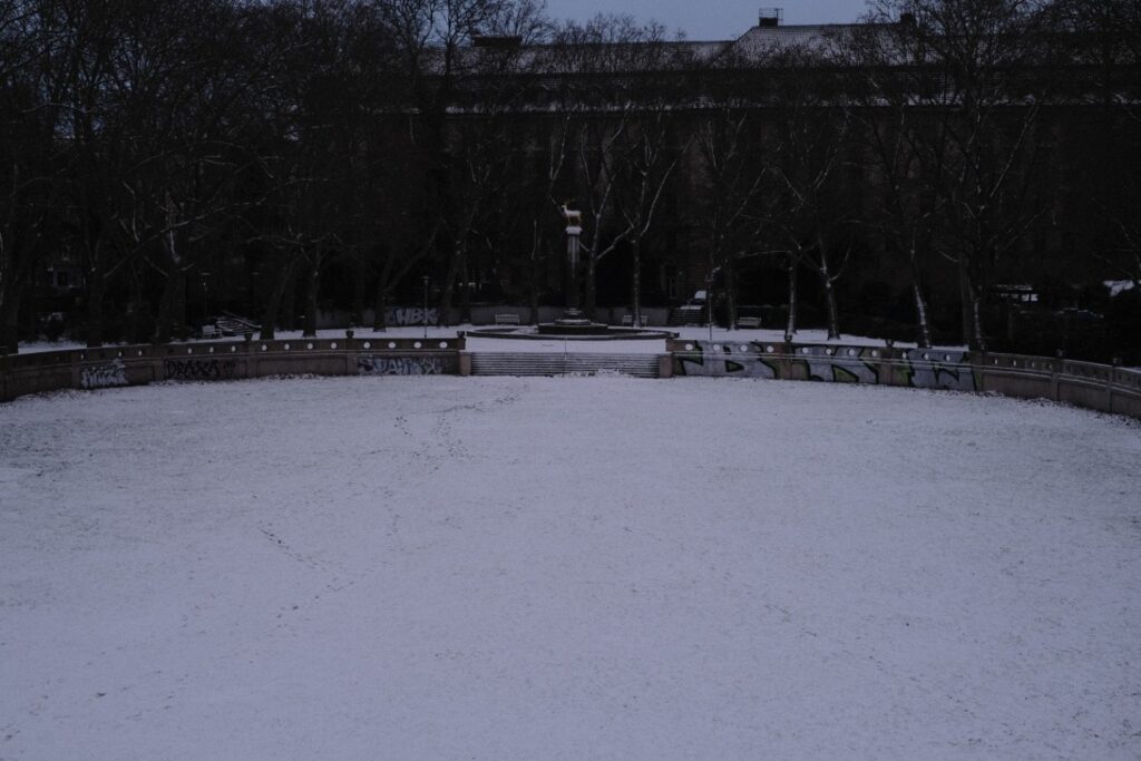 I walked into the local park when the snow was really fresh. The lawn where people used to sit in summer was all covered with snow. There’s this little wall that leads up to a fountain, and on this fountain there’s a column with a statue of a golden deer. In the background, you can see the bare trees.