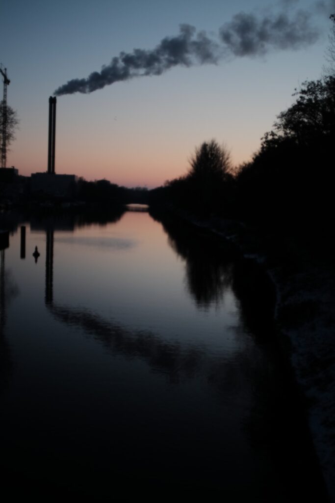 The other pictures I took were on my commute along the Teltow Canal. One was during sundown-;or after the sun had already gone down. You see the chimney of the power plant and the smoke rising. Then there’s the reflection of that in the water of the canal.