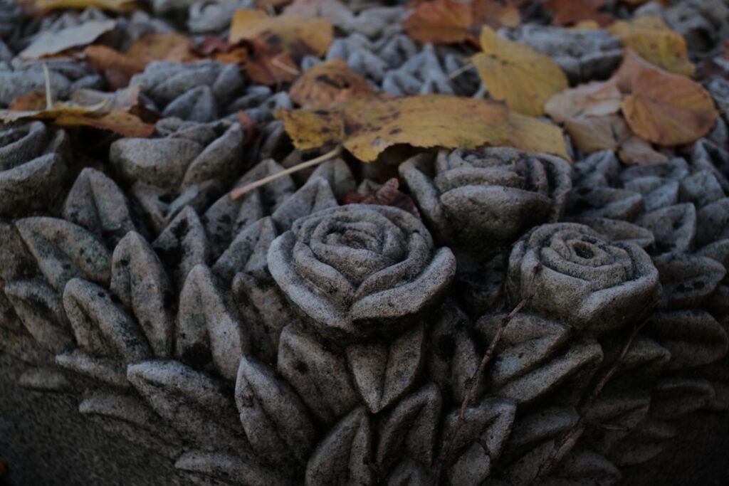 The third image shows a sculpture of roses in front of a tombstone. Yellow fallen leaves rest upon them like little blankets.