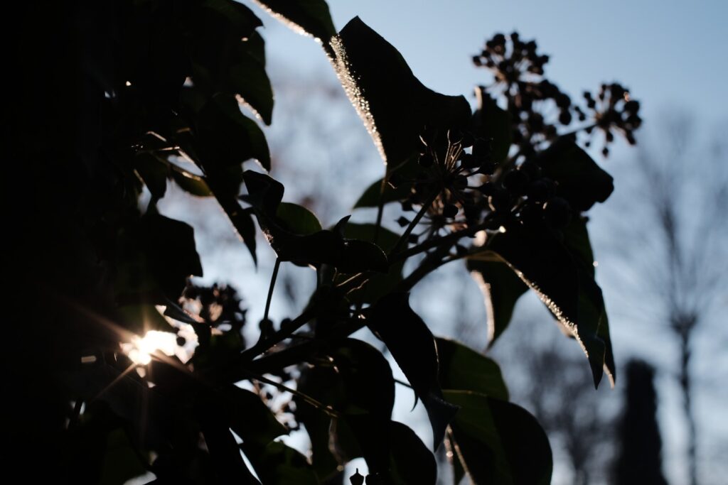 The first photograph unsettles me most. Branches of a plant, I don’t know what it is, photographed against the light. Very, very dark. Some lines of light on the leaves. Even though the dark shape is so prominent and present it does not block the light – on the contrary: It embraces the light to show its power.