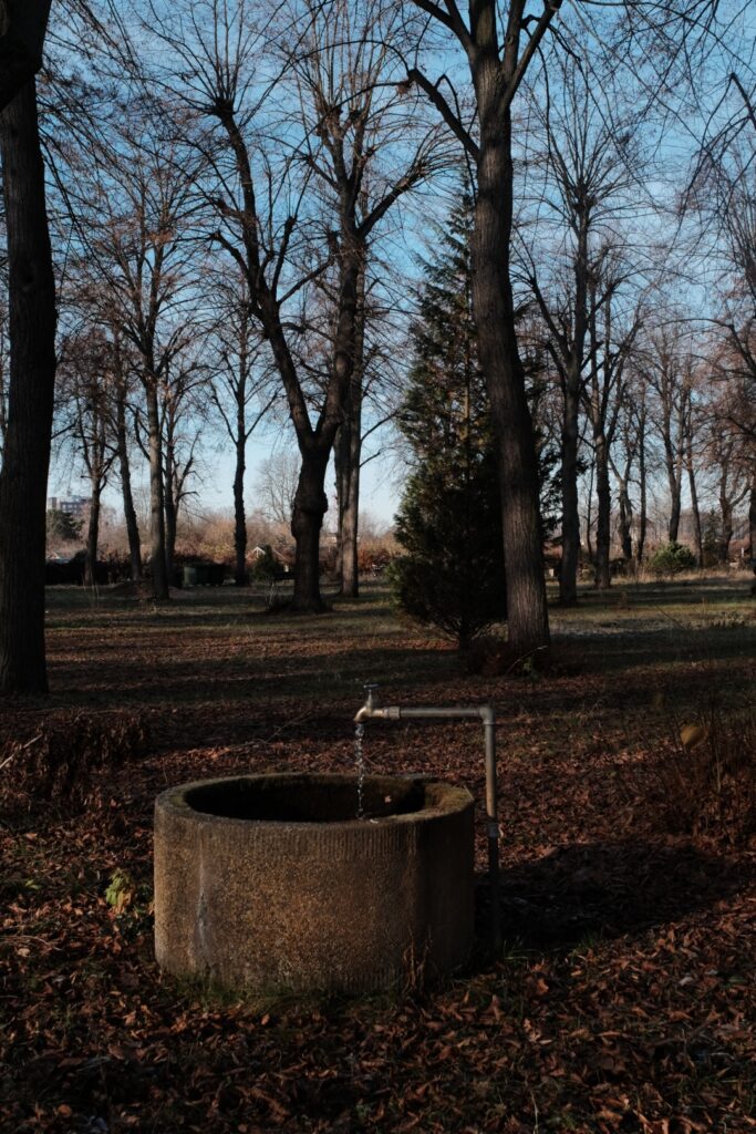 The second picture is different. In the foreground, a well with a water tap, water running. A clear view. In the background, blue sky and naked trees reaching upward.