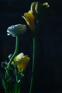 The last picture I took at home. A flower arrangement, photographed against a dark background, where the light quietly reveals petals and buds.
